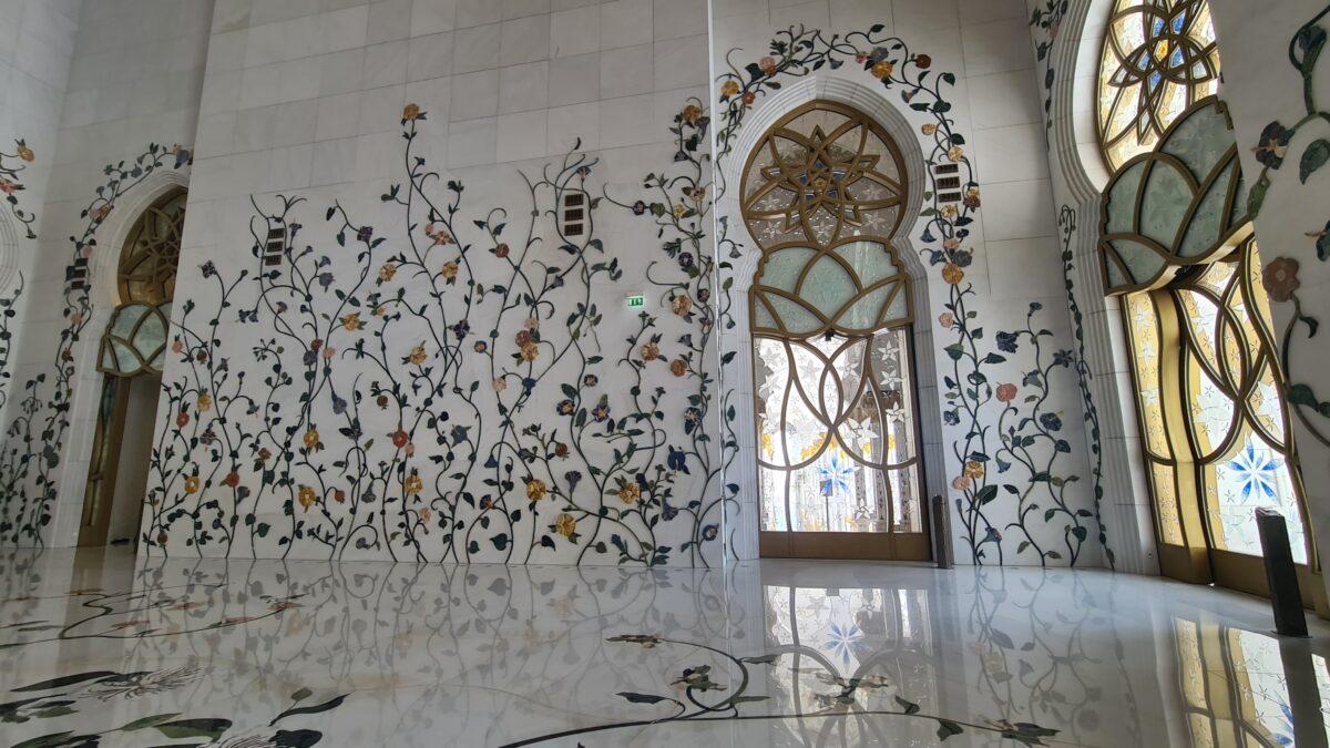 Wnętrze meczetu jest bogato zdobione kryształami Swarovskiego, złotem i mozaikami. Największy na świecie dywan oraz ogromne żyrandole dodają mu wyjątkowego blasku i elegancji.